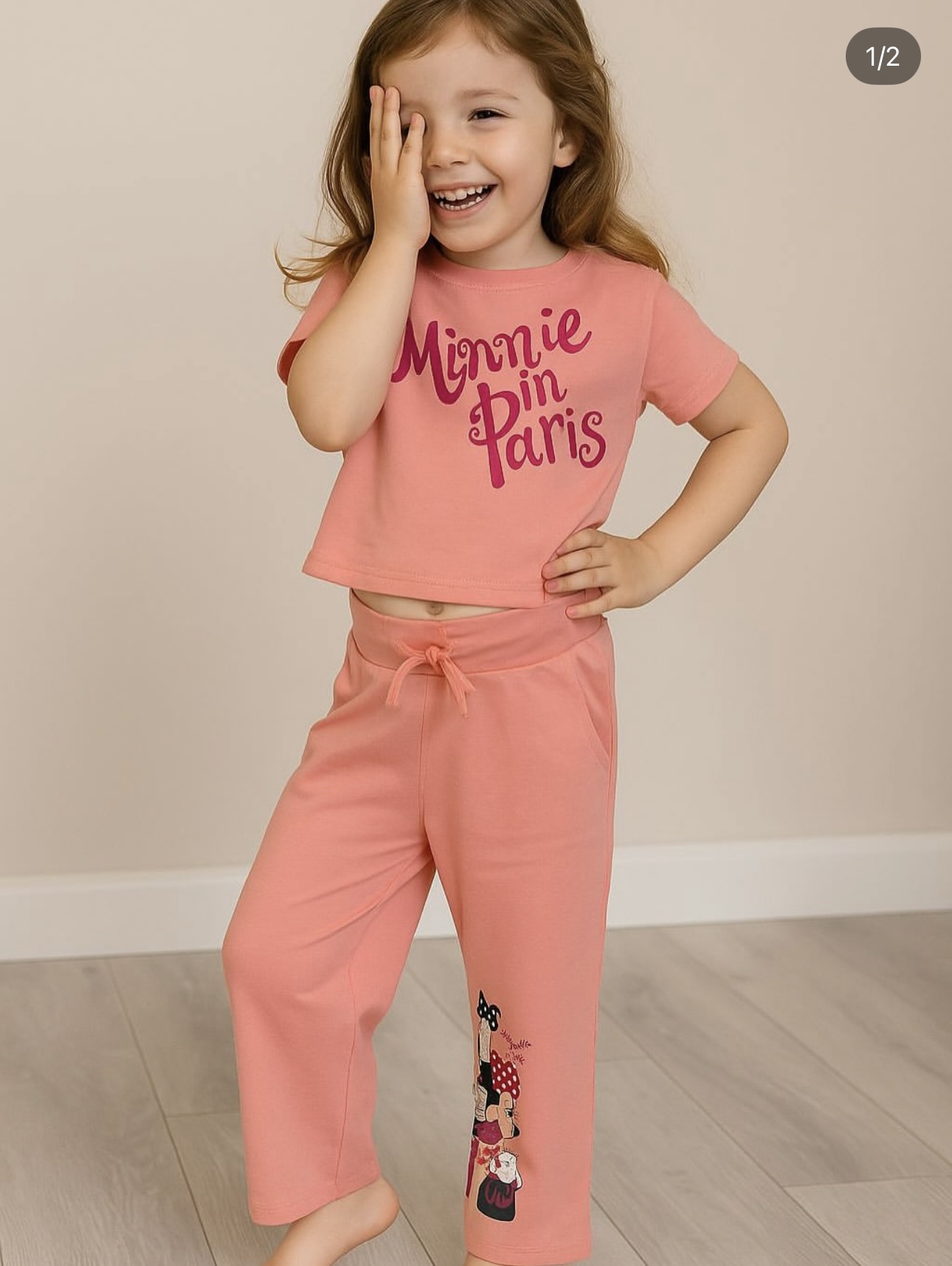 Add a fun and stylish touch to your child’s wardrobe with this adorable Minnie Mouse casual set. Designed for girls aged 4 to 13 years, this set includes a soft, breathable cotton crop-style t-shirt with a bold ‘Minnie in Paris’ print and matching easy-fit pants featuring a charming Minnie Mouse graphic. The pants come with an elastic drawstring waist for a secure yet comfortable fit, while the lightweight cotton fabric ensures all-day comfort, perfect for both indoor lounging and outdoor play. Available in two vibrant colors, this set is a must-have for young Minnie fans who love fashion and comfort combined.